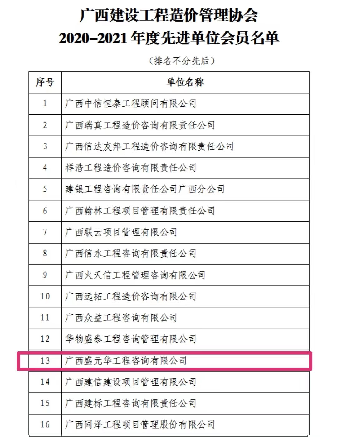據(jù)悉,廣西盛元華至2019年以來蟬聯(lián)獲得廣西建設(shè)工程造價(jià)管理協(xié)會(huì)的先進(jìn)單位會(huì)員,這不僅是行業(yè)協(xié)會(huì)和社會(huì)各界對(duì)廣西盛元華篤行不怠,砥礪奮進(jìn)為廣大客戶提供高品質(zhì)服務(wù)的肯定,更激勵(lì)了每一位盛元華人以“誠信為本 有諾必踐”為宗旨,在未來的工作中不斷提高服務(wù)品質(zhì),提高行業(yè)競(jìng)爭(zhēng)力而不懈努力!