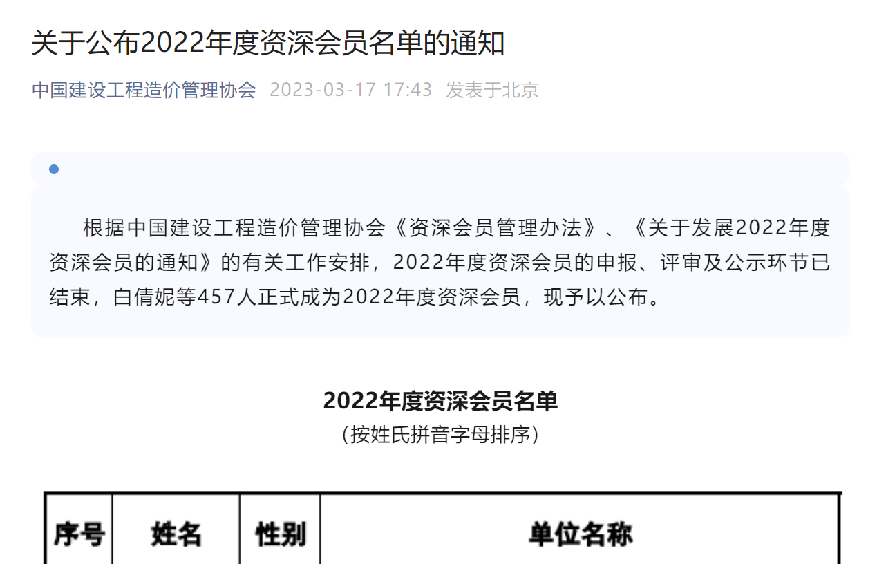 根據(jù)中國建設(shè)工程造價(jià)管理協(xié)會《資深會員管理辦法》、《關(guān)于發(fā)展2022年度資深會員的通知》的有關(guān)工作安排,2022年度資深會員的申報(bào)、評審及公示環(huán)節(jié)已結(jié)束,在公布的名單中,我集團(tuán)副總經(jīng)理陸冬、總經(jīng)理助理謝宇翔正式成為中國建設(shè)工程造價(jià)管理協(xié)會資深會員。